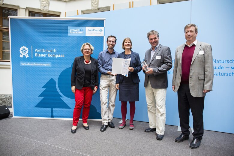 In der Kategorie "Bildungs- und Forschungseinrichtungen" wählte eine Fachjury mit Vertreterinnen und Vertretern aus Politik, Wissenschaft und Zivilgesellschaft das Geco-Lab, Kompetenzzentrum für geoökologische Raumerkundung der Abteilung Geographie, für sein Bildungsprojekt im Bereich Klimaanpassung aus insgesamt 111 eingereichten Bewerbungen aus. Professor Dr. Alexander Siegmund, Svenja Brockmüller und Daniel Volz nahmen die Auszeichnung aus den Händen von Bundesumweltministerin Svenja Schulze entgegen; die Laudatio hielt Jörg Sommer, Vorstandsvorsitzender der Deutschen Umweltstiftung.