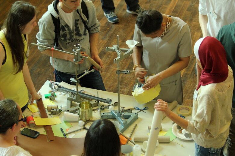 Am 12. Mai fanden sich die Schülerinnen und Schüler in gemischten internationalen Gruppen zusammen, um gemeinsam eine Kettenreaktion zu konstruieren. Unter Nutzung haushaltsüblicher Materialien wie u.a. Papprollen, Schnur und Wäscheklammern sowie naturwissenschaftlicher Kenntnisse entstanden vielfältige und vorwiegend funktionstüchtige Kettenreaktionen. Bei der mit großem Hallo begleiteten Präsentation dieser Kettenreaktionen wurde nicht nur Wert auf die Kreativität gelegt. Auch die physikalischen Phänomene wurden genauer unter die Lupe genommen.