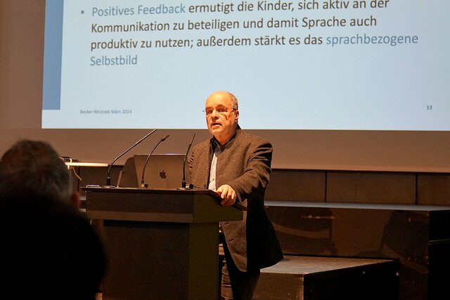 In seiner Keynote stellte Michael Becker-Mrotzek, Mitglied der Ständigen Wissenschaftlichen Kommission der Kultusministerkonferenz, zunächst die aktuelle Studienlage vor. Der langjährige Direktor des Mercator-Instituts für Sprachförderung und Deutsch als Zweitsprache zeigte am Beispiel des Deutschunterrichts in der Grundschule eindrucksvoll, wie die Anforderungen des flüssigen Lesens und Schreibens durch regelmäßige, kurze Übungseinheiten trainiert werden können. Wie ein Sportler zigmal trainieren müsse, den Ball in den Korb zu treffen, so müsse es auch in den Bereichen der basalen Kompetenzen – also Lesen, Schreiben und Rechnen – selbstverständlich werden, regelmäßig zu üben, so Becker-Mrotzek.
