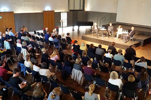 Im Anschluss eröffnete eine Podiumsdiskussion den Raum für vertiefte Debatten. Neben Stephan J. Kramer diskutierten Sabine Barth (Regionalkoordinatorin "Expertenteam Demokratiebildung" im Zentrum für Schulqualität und Lehrerbildung sowie Autorin bei IQES online), Dr. Havva Engin (Professorin für Interkulturelle Pädagogik und Leiterin des Kontaktstudiums "Extremismus und Radikalisierung" an der PHHD), Robert Feil (Referent für Demokratiebildung im Ministerium für Kultus, Jugend und Sport Baden-Württemberg) sowie Dr. Christian Mühleis (wissenschaftlicher Mitarbeiter der Abteilung Politikwissenschaft der PHHD). Wissenschaftsjournalist Armin Himmelrath moderierte die Veranstaltung erneut in gewohnt professioneller wie schlagfertiger Manier.