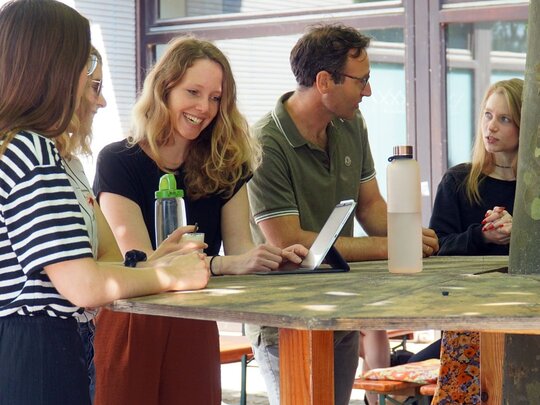 Gutgelaunte Studierende sitzen mit Laptops und Getränken draußen an einem Biertisch